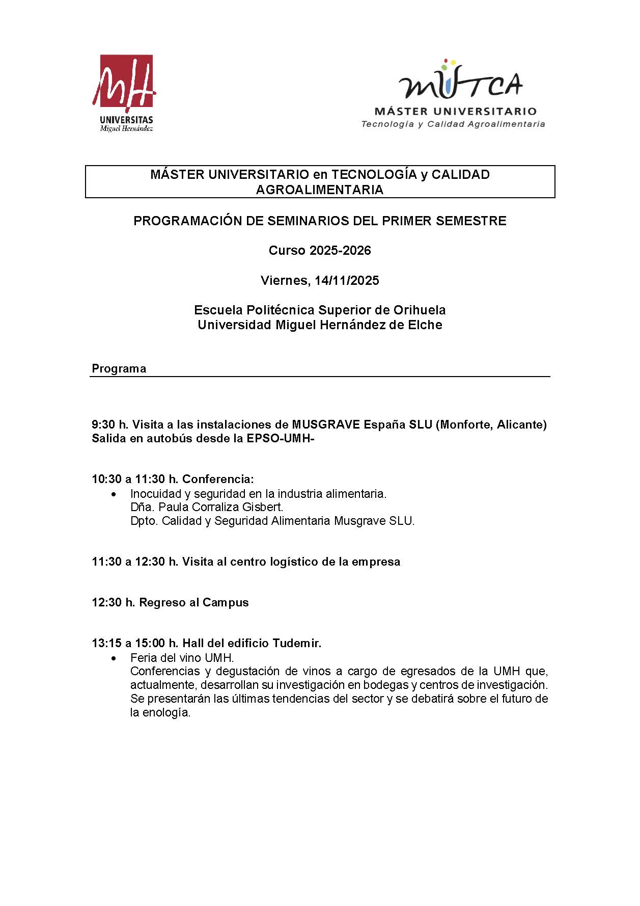 Programación de seminarios del primer semestre del MUTCA cm.3 por | Nov 10, 2025 | Seminarios | 0 Comentarios Programación de seminarios del primer semestre del MUTCA Os compartimos información relativa a los seminarios que se impartirán en el Máster Universitario en Tecnología y Calidad Agroalimentaria este primer semestre. Fecha: 14 de noviembre de 2025 Enviar comentario Cancelar la respuestaTu dirección de correo electrónico no será publicada. Los campos obligatorios están marcados con *Comentario Nombre * Correo electrónico * Web Guarda mi nombre, correo electrónico y web en este navegador para la próxima vez que comente. Current ye@r * Leave this field empty